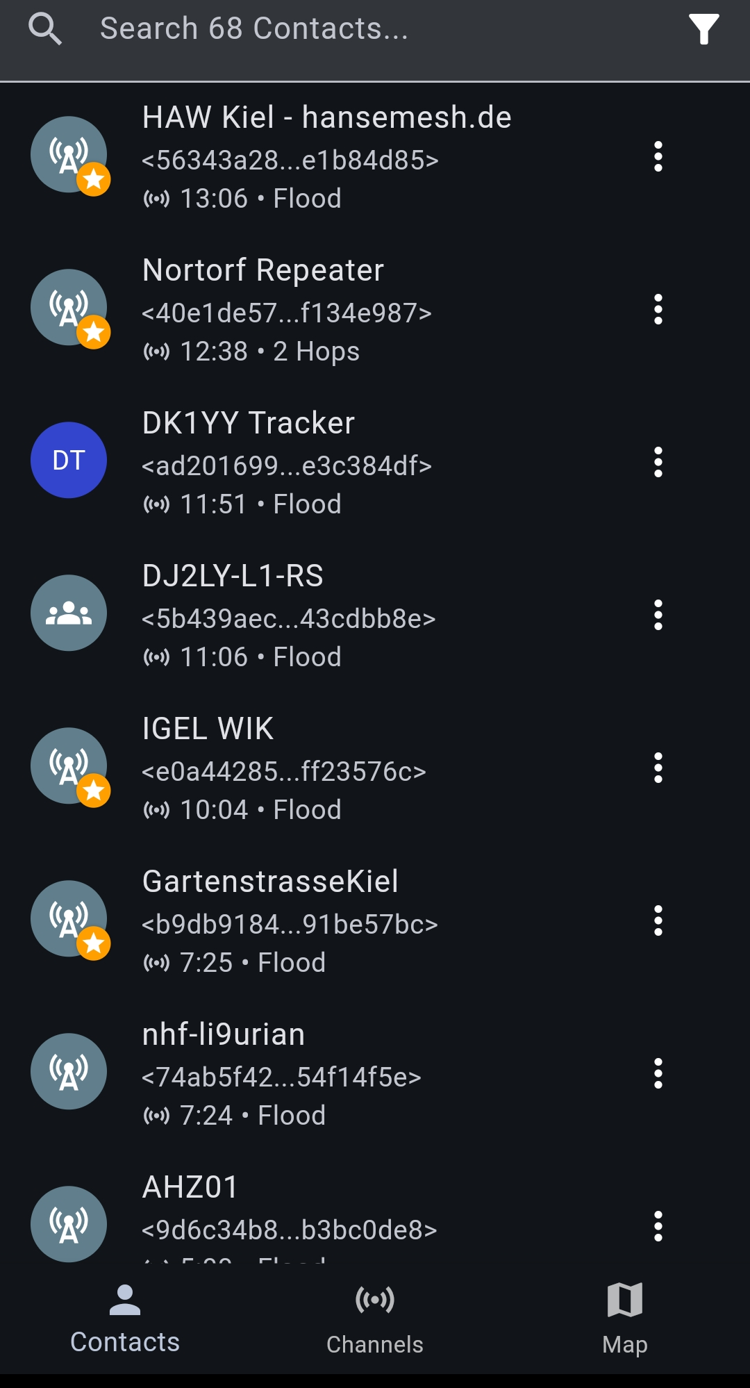 Auf der Karte den gewünschten Repeater in der Nähe antippen und anschließend die ersten beiden Zeichen des "Public Key" merken. Diese beiden Zeichen dienen als Namen der Repeater, sie lassen sich für die Pfadliste von trace nutzen. Jeden Abend mache ich einmal kurz den Test, ob "meine" Repeater in den drei Nachbarstädten erreichbar sind. Ich gebe dafür die ersten beiden Zeichen des "Public Keys" eines Repeaters für den Hin- und den Rückweg ein. Konkret: Von meinem Hausrepeater "b9" ausgehend gebe ich den für mich wichtigsten Repeater in Kiel an ("18"), die Kette lautet insgesamt "b918b9". Oder wenn ich einen Nutzer, vergraben zwischen den Häuserwänden in der Gartenstraße in Kiel, dessen Repeater dort ein "9b" hat, erreichen möchte, teste ich den Pfad bis zur Gartenstraße mit "b918569b5618b9". Man muss damit rechnen, dass ein solch langer Trace über hin und zurück 7 hops nicht heil durchkommt, mehrere trace-Versuche können nötig sein. Damit solch ein Versuch gelingt, muss jeder der beteiligten Repeater darauf warten, einzig und allein meinen Trace bedienen zu dürfen. Bei den wichtigen Repeatern einer Stadt ist das unwahrscheinlich, dass sie unterbeschäftigt sind. Wenn man weiss, wie gering die Sendeleistung ist, dass die Sendezeiten in diesem Funkstandard zeitlich beschränkt sind, dass ingesamt eine Luftlinie-Entfernung von 22km besteht und der Empfang zwischen Häuserschluchten funktechnisch sowieso immer ein Problem darstellt, und dass die Zahl an Meshcore-Nutzer*innen, die die wenigen lauten Repeater einer Stadt nutzen, zunimmt, dann ist diese leicht erratische Antwortverhalten zu verschmerzen. Es gilt aber auch: Eine Nachricht nur einmal zu einem Empfänger in die Gartenstraße hin zu transportieren bedeutet, dass nur die Hälfte der Kette für den Moment des Hintransports halten muss, was die Wahrscheinlichkeit der Ankunft einer Nachricht schon mal verbessert. Und zugleich lernt man bei ernsthafter Anwendung, dass eine gelingende Kommunkation, vom Sender initiiert, drauf angewiesen ist, dass ein Text wie "ok empfangen" vom Empfänger zurückgeschickt wird.